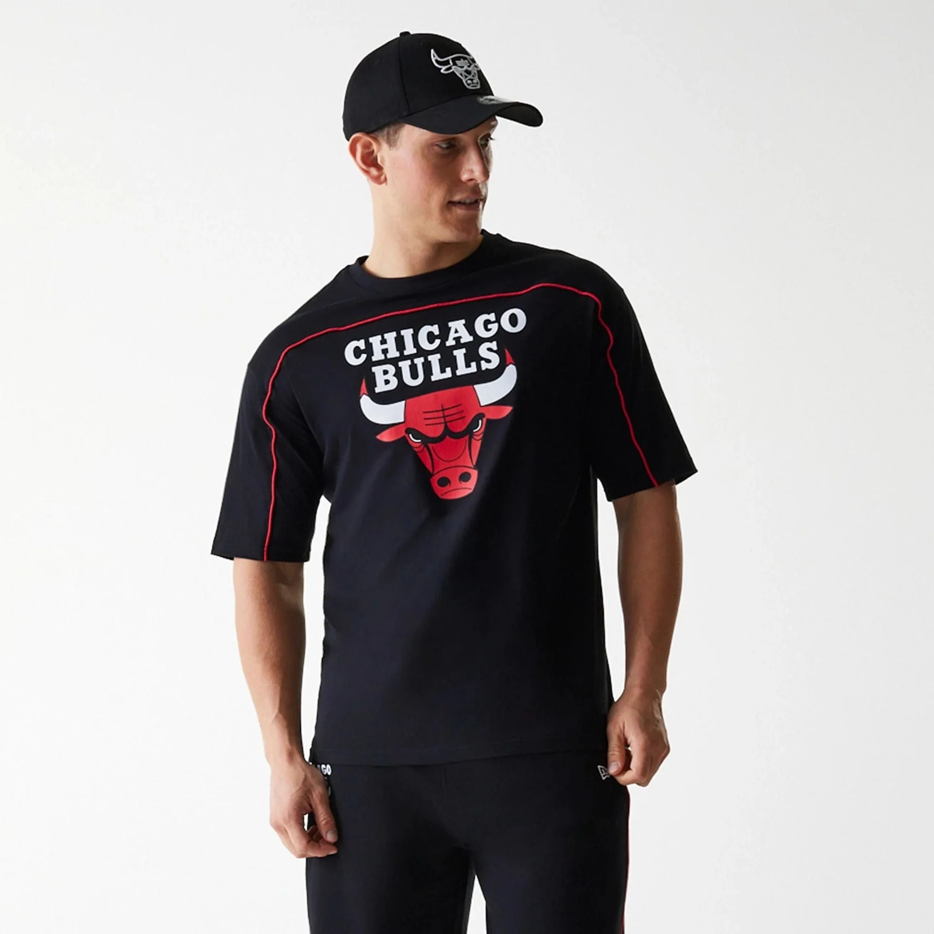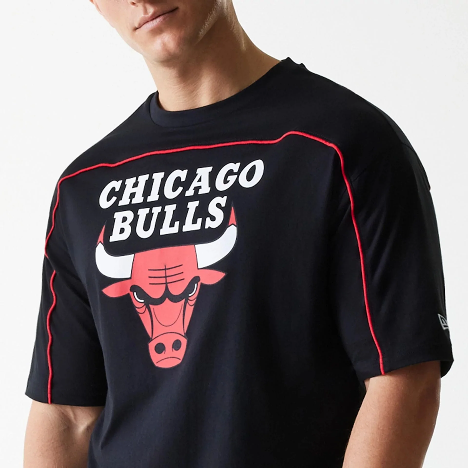 Camiseta Oversized Chicago Bulls NBA Piping Logotipo del equipo en la parte delantera Logotipo New Era bordado en la manga izquierda Ajuste oversized El modelo mide 1,80 m y lleva una talla M 100% ALGODÓN